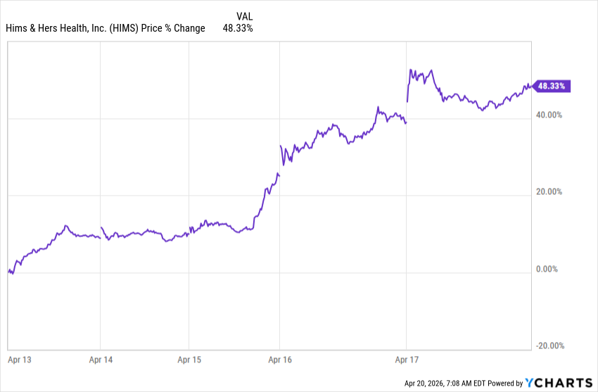 HIMS didn’t jump all at once. The stock started moving earlier in the week, but the rally clearly accelerated on April 16 once the FDA / peptide story came into focus.