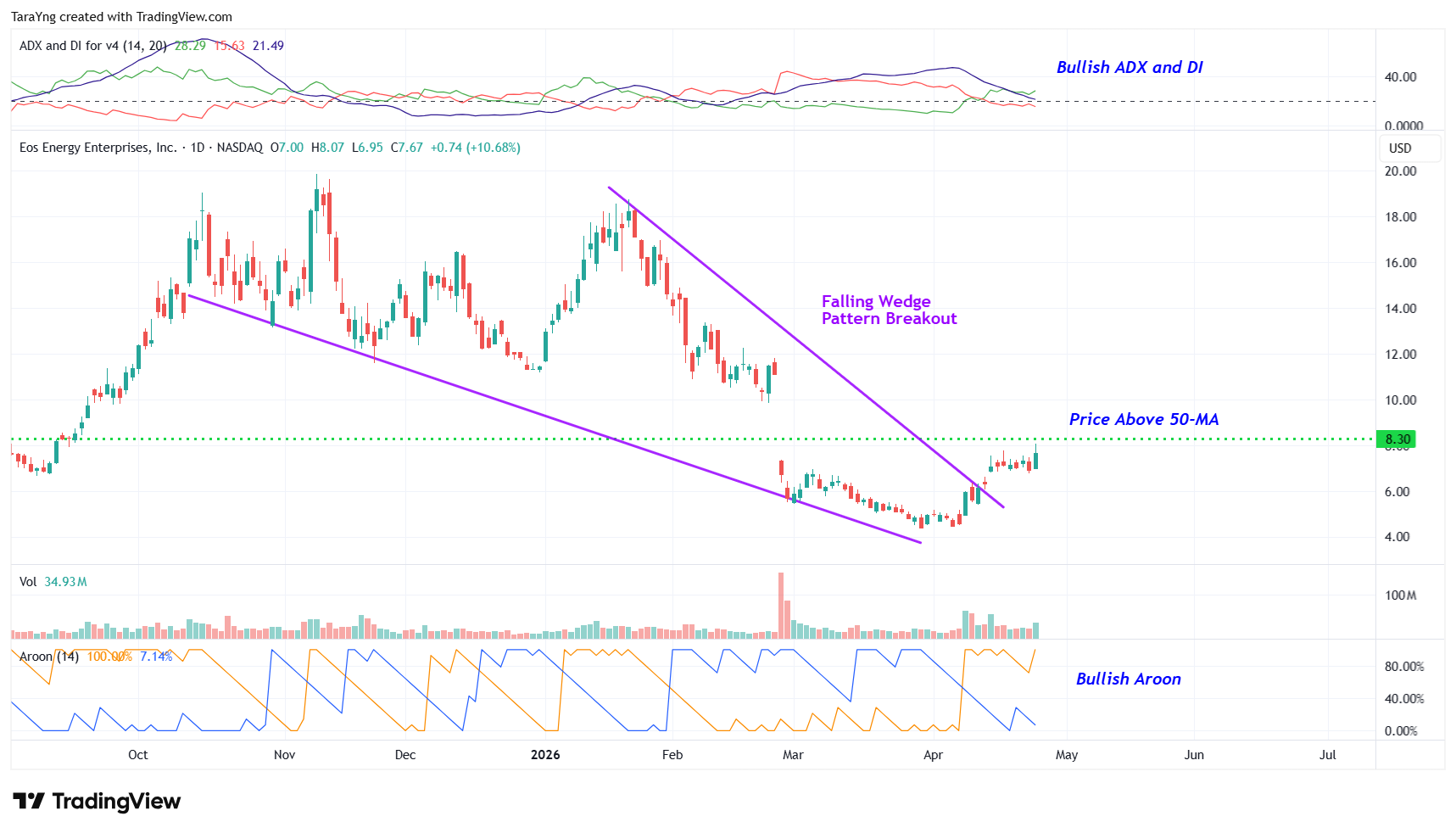 #1 Falling Wedge Pattern Breakout: EOSE had been carving out a falling wedge pattern over the past several weeks, visible via the converging purple trendlines on the daily chart. The stock has now broken above the upper boundary of this wedge, which is a classically bullish signal. Falling wedges are continuation/reversal patterns that reflect diminishing selling pressure: lower highs and lower lows compress into a tighter range as sellers exhaust themselves. The breakout signals that buyers have absorbed that supply and are beginning to assert control. Historically, this pattern often marks the final shakeout before a meaningful upmove.