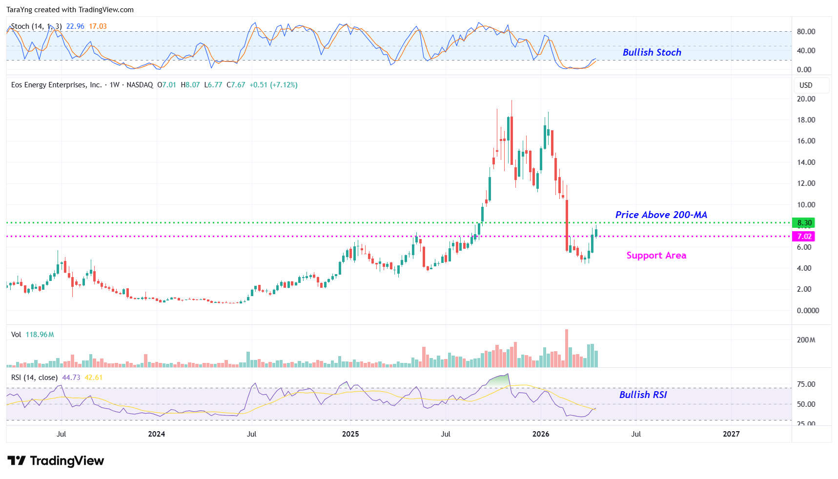 #5 Above Support Area: Zooming out to the weekly chart, EOSE has bounced from a key level (pink dotted line) that previously acted as resistance and has since flipped to support. This is a classic technical structure that adds conviction to the long case. Importantly, the stock is also holding above its 200-week SMA, which tells us the long-term trend remains intact.